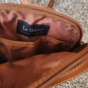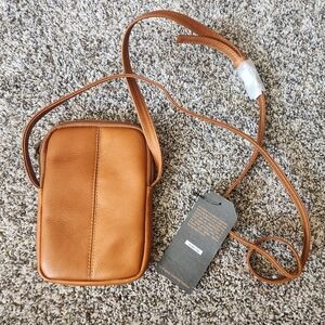 Stylish leather crossbody bag in a rich tan color. Perfect for everyday use. Brand new with tags. Given to me as a gift and unfortunately I just never reach for it. Approximately 5" x 7" x .75"