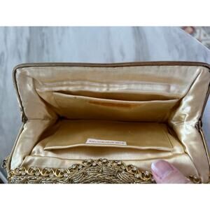 Very good condition, small amount of beading missing at base of one strap, brand tag detached. Beading is secured and it will not continue to lose more beads. Luxury handmade bag from the 1950s. Gold swirl beading, beaded strap. Gold filigree latch with rhinestone decoration. Interior gold satin with gold pockets. Brand tag has become detached with small amount of glue residue.