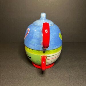 Selling a Le Gourmet Chef 2005 Christmas Ceramic 3-Piece Tea for One Set. This festive set measures 6.25" tall when stacked, and feastures Santa Claus by a Christmas tree, with presents and a candy cane. There is a chip with a crack on the rim of the cup (shown in the pictures). The teapot portion is in great condition!