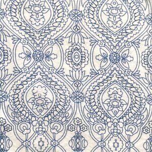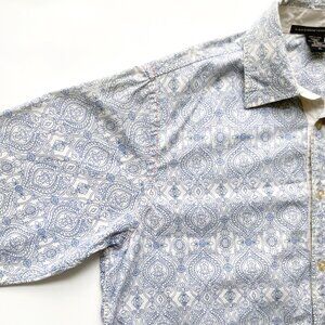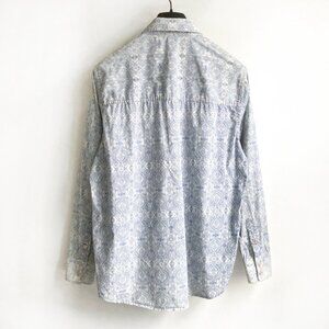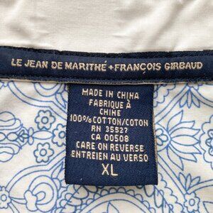 Rockabilly meets Baroque meets Streetwear in this all cotton shirt from Le Jean de Marithe + Francois Girbaud. Blue swirly floral pattern on an antique white background with red accent stitching and branded white buttons (extra inside). A hint of a chest pocket on the outside and an actual pocket on the inside. Long sleeves with button cuffs.