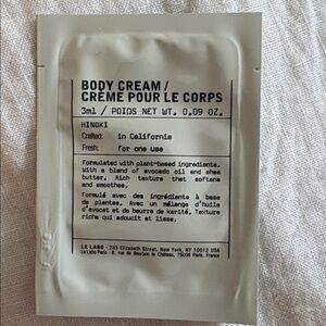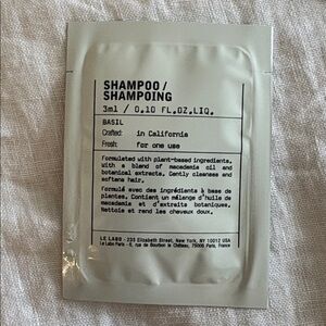 Le Labo shampoo, conditioner, body, cream, and shower gel. Eight packets in all. Perfect for travel.