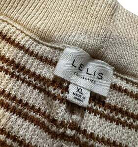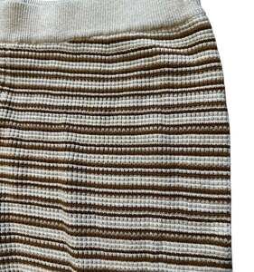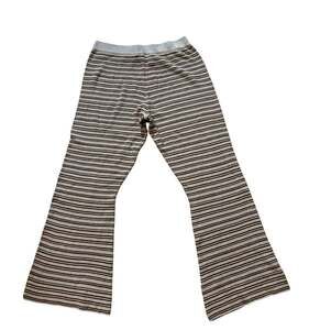 Le Lis Collection Brown & Cream Striped Wide Leg Knit Pants, Size XL. These comfortable and stylish high-rise pants feature a unique knit texture with horizontal brown and cream stripes throughout. Made from a blend of 55% Acrylic and 45% Cotton, they offer a soft feel with a flattering wide-leg silhouette. Waist measures 15 inches laying flat, and inseam is 28 inches. Excellent pre-owned condition, perfect for casual wear or dressing up.