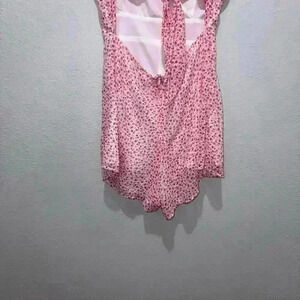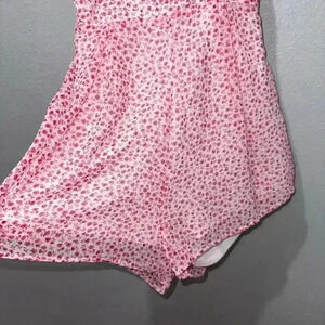 This is a cute, pre-owned floral romper. It is size M and made of 100% polyester. It has a tie in the back and a white lining. It is in good condition.