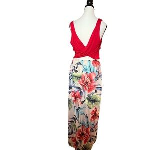 Le Lis Floral Maxi Dress Red Top Criss Cross Back Women’s Size L Made In USA
