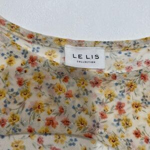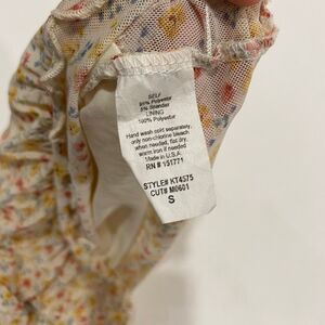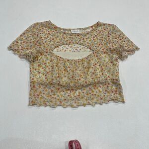 Adorable Le Lis mesh floral crop top in size small. Sheer mesh overlay with yellow, pink, and blue tiny florals and lettuce-edge ruffle trim on the sleeves and hem. Has a soft inner lining for comfort. Super cute for spring/summer, layering, or Y2K aesthetic outfits. Gently worn, no major flaws.