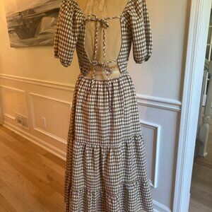 This dress is super fun! Mid length, tie back, easily dressed up or down. Fabric is heavier, giving it a more expensive look.