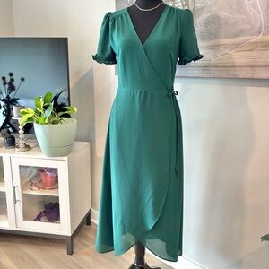 🌿 Le Lis Green Wrap Dress Small Ruffle Sleeve Tulip Hem Lined V-Neck Tie Waist