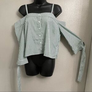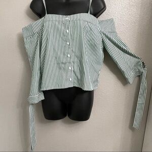 Le Lis Green and White Striped Off Shoulder Top with Tie Straps at Wrists Medium