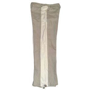 Le Lis colorblock stripe pants featuring a relaxed, tapered silhouette with an athletic-inspired side stripe. Made from a soft, lightweight woven cotton in a neutral taupe-gray tone with contrasting white side panels, they offer an easy pull-on feel with a tailored look. Designed with front pockets, a zip fly, and gathered ankles for a sleek jogger finish.