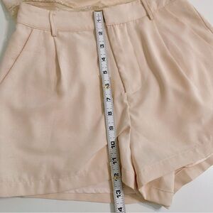 Matching light muted peach shorts with zipper closure, belt loops and side pockets