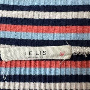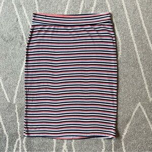 Super soft and comfy stretch ribbed pull on pencil skirt by Le Lis. It has the prettiest pink, navy and white striped pattern and literally feels like pajamas to wear. In great condition. No stains or holes. 15-17” across stretch waist, 23.5” length.