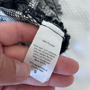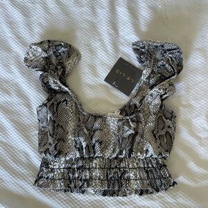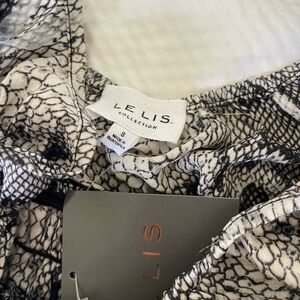 This chic sleeveless blouse by Le Lis showcases a classic black and white color scheme, accentuated with elegant ruffled and smocked details. Its sophisticated design makes it a versatile piece, ideal for both casual outings and formal events.