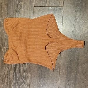 Rust-colored ribbed bodysuit. Features a twisted front design. Sleeveless and stylish.