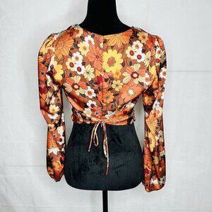 Le Lis Satin Deep V Cropped Blouse Sz S Floral Orange Brown Back-Zip Tie