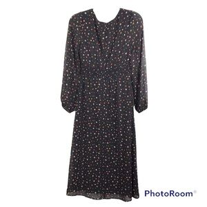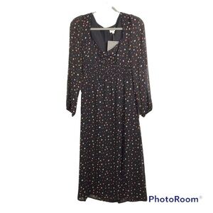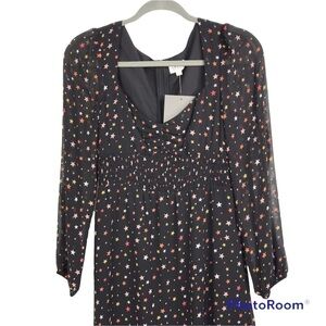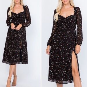 Brand new Le Lis Starry Nights midi dress. Classic black color with contrasting stars pattern in fall colored hues. Feminine sweetheart neckline. Semi sheer long sleeves. Fully lined. Sexy side slit adds a sophisticated touch. Elastic smocked waistband for fit and comfort. Back zip closure. Sold on Stitchfix.