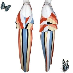 Le Lis Striped Tiered Ruffle Belize Jumpsuit Multicolor Orange Blue Large L