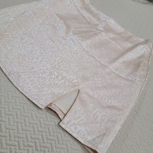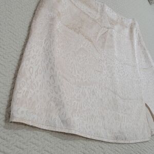 Pretty silky (polyester) monochromatic leopard print slip skirt. Front side slit. Zipper closure. Lined. Cream color.