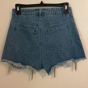 Le Lis Women’s distressed denim shorts with rhinestone tassels, raw hem. Size S