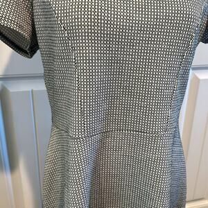 New without tags (NWOT) Le Lis Teylyn short sleeve textured knit dress. Women’s X-large. Dress appears gray from a distance but up close you can see the fabric actually consists of white and black textured knit in geometric design, such as classic and versatile look. This fit and flare dress is a stylish choice for work or special occasions. Silver zipper with black fabric trim down the back adds detail, neckline is a simple scoopneck and short cap sleeves are easy to pair with a suit jacket or blazer for a day to evening look as well. Can easily be elevated with some heels and statement necklace for a chic look and the classic gray colorway pairs well with statement or neutral shoes and accessories. Texture of this dress lends it to fall or winter wear and the fabric is substantial, unlined but is not sheer at all. Stitch detailing on bodice and at waist provide a tailored look but the material actually has lots of stretch, very comfortable fit with this dress.