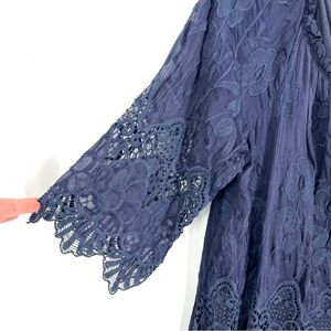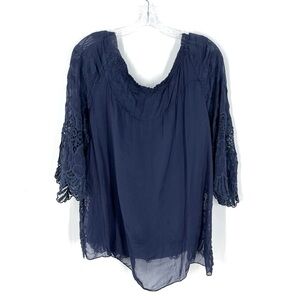 Le Marais Paris 100% Silk Blue Blouse Size M Artsy Bell Sleeve Lace Embellished. Excellent preowned condition. Gently worn, no flaws. This item comes from a smoke free, pet free home.
