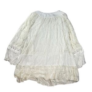 The Le Marais Paris Women’s Silk White Lace Long Sleeve Blouse in size L is a stylish and versatile tunic-style top perfect for any occasion. Made from luxurious silk with a delicate lace fabric, this blouse features a scalloped fan print pattern, wide round neckline, and long sleeves for a sophisticated look. The relaxed fit and pullover closure make it comfortable and easy to wear, while the lining provides added style and structure. Hand wash only to preserve the quality of this timeless and elegant piece.