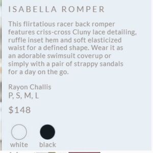 This flirtatious racer back romper features criss-cross Cluny lace detailing, ruffle inset hem and soft elasticized