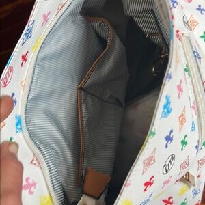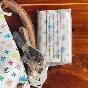Stylish and vibrant, the women's bag features a multicolor pattern on a white background. Perfect for adding a pop of color to any outfit.