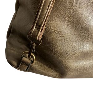 The Le Miel Olive Colored Large Purse is a stylish and versatile accessory for women. Made from faux leather with a solid olive exterior, this satchel/top handle bag features gold hardware accents and a convenient zip closure. It comes with both a shoulder strap and hand straps. The adjustable shoulder strap adds a level of comfort and convenience, making this purse a practical and fashionable choice for everyday use. 14x15. Item P181