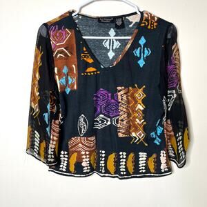 Le Mieux Studio, women's blouse, medium, sheer sleeves, boho chic, abstract print, v-neck, long sleeve, artsy style, tribal pattern, eclectic fashion, festival wear, lightweight, flowy, statement top, hippie aesthetic, vintage-inspired, indie style, casual blouse, unique design