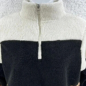 Le Moda Womens Size Large Top Leopard Black Off White Colorblock Fleece Pouch Pocket 1/4 Zip Boho
