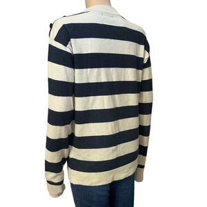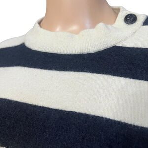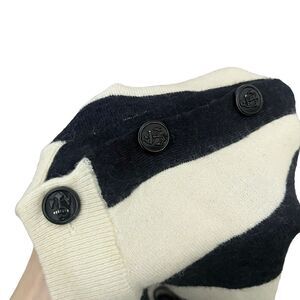 Crew neck pullover sweater. Chic rugby strip pattern. Nautical buttons on the shoulder. Alpaca blend knit.