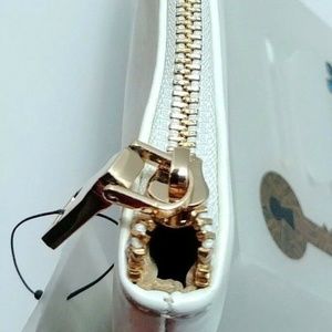 A dark base and meaningful mantra offset this crisp white clutch. Unzip the compact design to find dual compartments with organizing pockets.