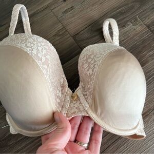 DETAILS: Le Mystere bra women's 32F, Safari contour style in Sahara Cream, lace trim, molded cups, underwire, back hook eye closure. Nylon spandex, hand wash.