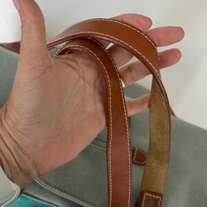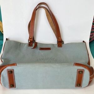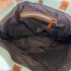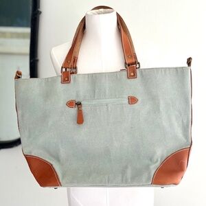 Le Papillon Green/Grey Canvas Brown Leather Double Handle Shoulder Tote Bag
