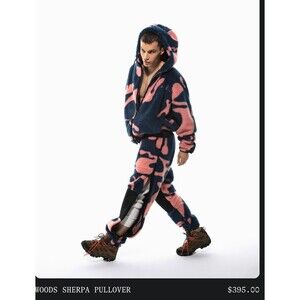Le PÈRE Designed in collaboration with Ian Woods, this plush fleece pullover incorporates a cloud-like pink jacquard pattern that is inspired by Ian's collage work.