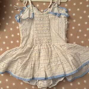 Adorable Le Petit Elle sunsuit in size 9/10. This boutique hand made piece features a charming smocked bodice and a delightful tutu skirt with swiss dot detailing. Perfect for sunny days and special occasions!