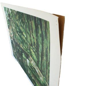 Condition: My great-uncle just nailed it on the wall, as you can see from the two nail holes in the 4th picture. The paper is damaged on the top right corner, as seen in the 5th picture. Also, the 6th picture shows that the paper on the top right corner no longer sticks to the cardboard backing. The print area is in great condition, no flaws or damage.