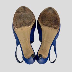 Le Silla blue platform slingback stiletto heels with open-toe. Gold-tone detail on platform and at toe.