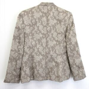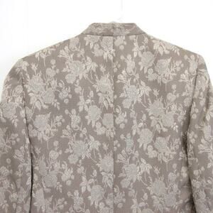 Le Suit 2 piece women's taupe suit. Beautiful dressy suit in a taupe jacquard floral pattern. Features faux diamond buttons. Shoulder pads. Skirt with side zipper. Fully lined.