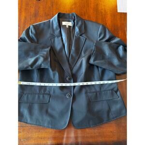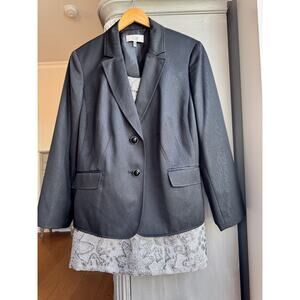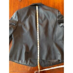 Make a statement with this elegant Le Suit evening blazer in size 18W! The classic black on black design is elevated with stunning metallic thread detailing, perfect for adding a touch of festive sparkle to any outfit. Pair it with a black satin skirt or tuxedo pants and a silky blouse, and you have a sophisticated evening outfit for the holiday season!