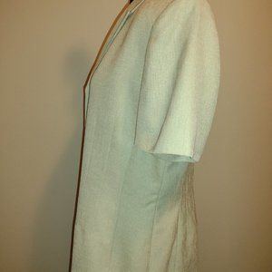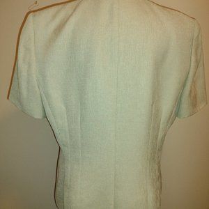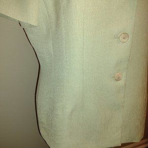 Size-14, Le Suit Essentials, 2pc Pant Suit, Light Green Color. Jacket Descriptions: 3-front buttons, length 26.5 in., short sleeves 10 in., w/padded shoulders, and back width 17 in. Pants w/left-side zipper: waist-18 in., length 41.5 in., inseam 30.5 in., rise 13 in., leg bottom 11 in. Both jacket and pant has green lining.