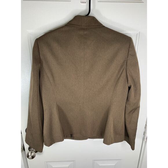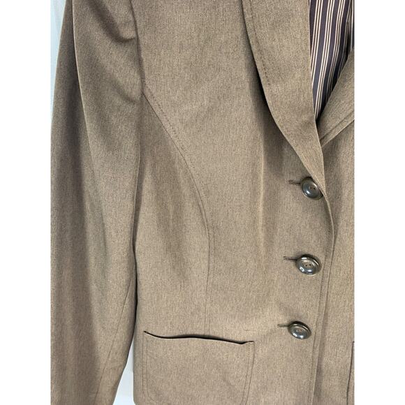 This Le Suit Petite blazer in size 12P offers a polished look with its brown hue and striped lining. The button-front design adds sophistication to professional attire, while the structured fit ensures comfort and style in business settings.
