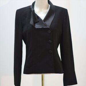 Le Suit Woman Black Jacket Satin Bow Collar V-Neck Buttons Lined