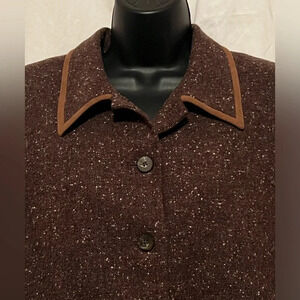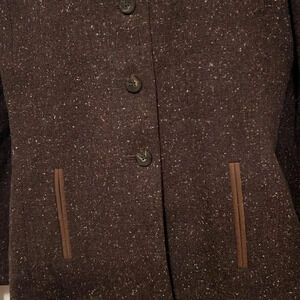 Businesslike and formal, this wool blend tweed two piece suit is warm and comfortable. Shades of brown and lined mean that this suit is "suitable" for Fall & Winter occasions!
