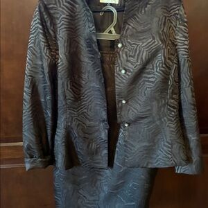 Stylish zebra pattern dress set. Features long sleeve jacket and matching skirt. Ideal for formal events.