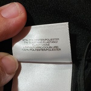 This Le Suit skirt is a classic pencil-style piece crafted from a blend of 97% polyester and 3% elastane, ensuring a smooth and slightly stretchy fit. The skirt is fully lined with 100% polyester for added comfort and a polished finish. Its tailored design features a high waist and a structured silhouette that flatters the figure, making it an excellent choice for professional or formal settings. The solid black color adds versatility, allowing it to be paired effortlessly with various tops, blouses, and blazers for a sophisticated look. This skirt embodies timeless elegance with modern comfort.