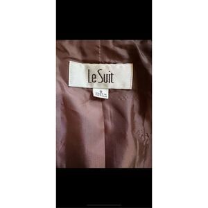 Le Suit two piece skirt set beautiful texture very expensive suit size 8 see measurements in pictures. The color is very unique. It’s a brown with a black and silver metallic and two pockets on the blazer and pleated blazer. Small slit in the back of skirt built-in lining.