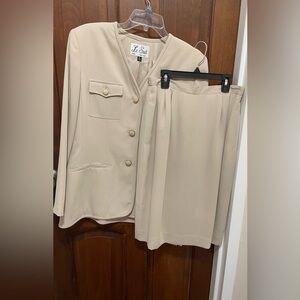 Le Suite size 10 Elegant cream blazer and skirt set . Long sleeve three buttons at front and four pockets. Two welt pockets. Fully lined. It has shoulder pads. Polyester, material type Creep. Pit to pit 20” length 28.5” sleeve 24”