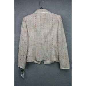 This is a beautiful Tweed Le Suit Collections Skirt Suit that is a size 6. It is called, "Pretty in Tweed". It is new with tags and an extra button. It retailed for $200. It is lined with 100% Acetate. The suit is 44% Polyester, 34% Acrylic, and 22% Cotton. Laying flat, the jacket measures: Armpit to armpit-19" and the length is 22". The skirt has a zipper on the side and has a 28" Waist. The length is 24". It is very classy and would be great for the office or any business.