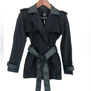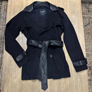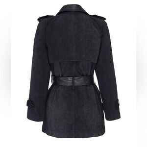 New without tags. Le Superbe washed black belted trench coat. Double breasted, faux leather accent trim. Removable belt. 100% cotton.